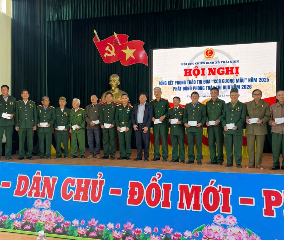 Chiều ngày 26/12/2025, Hội Cựu chiến binh (CCB) xã Thái Ninh đã long trọng tổ chức Hội nghị tổng kết công tác Hội và phong trào thi đua “Cựu chiến binh gương mẫu” năm 2025. Dự và chỉ đạo hội nghị có đồng chí Phạm Văn Chung – Bí thư Đảng ủy, Chủ tịch HĐND xã; cùng các đồng chí trong Thường trực Đảng ủy, HĐND, UBND, Ủy ban MTTQ Việt Nam xã; đại diện các ban, ngành, đoàn thể; các đồng chí Bí thư chi bộ và hơn 100 hội viên đại diện cho trên 1.700 hội viên CCB trong toàn xã.