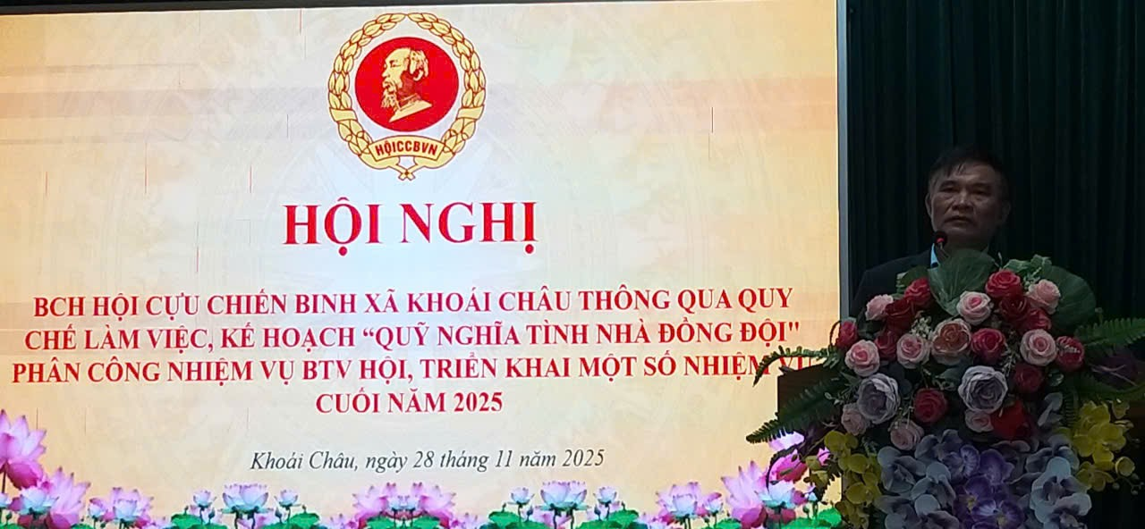 Hội nghị triển khai Kế hoạch tổng kết nhiệm vụ công tác Hội năm 2025, phương hướng nhiệm vụ công tác Hội năm 2026 và một số nhiệm vụ trong tâm trong thời gian tới, triển khai nhiệm vụ phối hợp với các ngành đoàn thể hỗ trợ công tác tuyển quân năm 2026. Đồng thời Ban chấp hành Hội Cựu chiến binh xã phân công nhiệm vụ cụ thể cho từng ủy viên Ban thường vụ, Ban chấp hành Hội, bảo đảm rõ người, rõ việc, rõ trách nhiệm, triển khai nhiệm vụ công tác phát triển phong trào thi đua “Cựu chiến binh gương mẫu” và xây dưng tổ chức Hội trong sach vững mạnh. Hội nghi diễn ra nghiêm túc, dân chủ và đạt kết quả tốt, tạo tiền đề quan trọng cho hoạt động của Hội Cựu chiến binh xã Khoái Châu khóa I nhiệm kỳ 2025-2030.