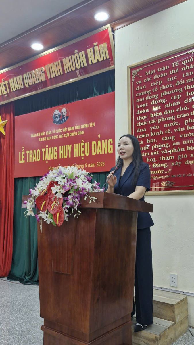 Phát biểu tại buổi lễ, đồng chí Ngô Thị Kim Hoàn nhấn mạnh: “Huy hiệu Đảng không chỉ là niềm vinh dự, tự hào của cá nhân, mà còn là niềm vui, niềm vinh quang của cả tổ chức Đảng. Mong rằng đồng chí Nguyễn Thái Bình tiếp tục nêu gương sáng, đóng góp trí tuệ và kinh nghiệm cho sự nghiệp xây dựng Đảng, phát triển quê hương Hưng Yên giàu đẹp, văn minh.”