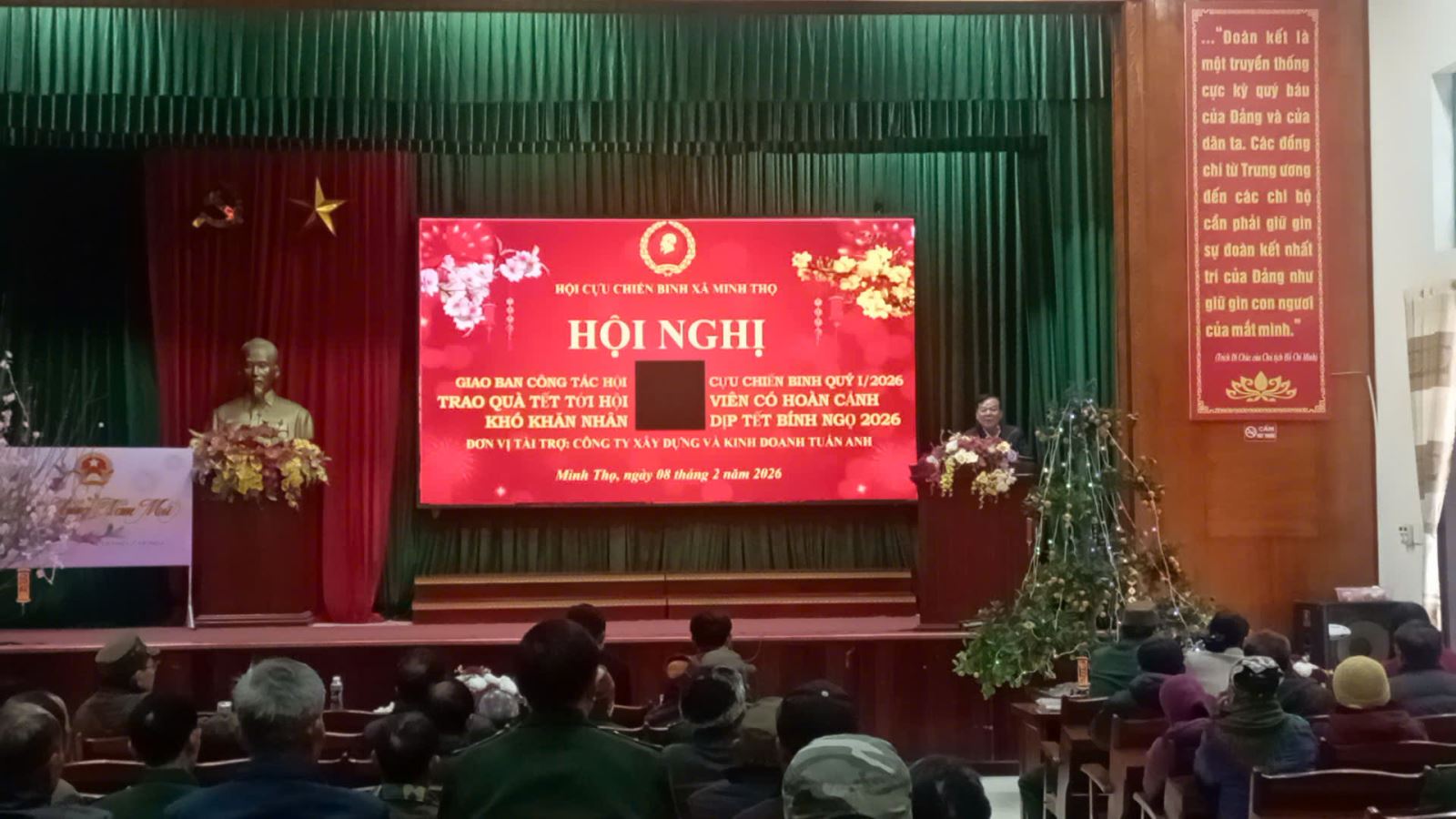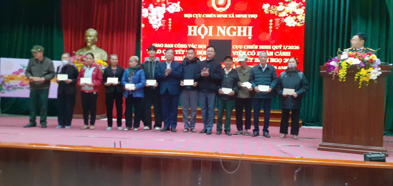 Sáng ngày 08/02/2026, Hội Cựu chiến binh xã Minh Thọ tổ chức Hội nghị giao ban công tác Hội quý I năm 2026, đồng thời phối hợp trao quà Tết cho hội viên CCB có hoàn cảnh khó khăn nhân dịp Tết Nguyên đán Bình Ngọ 2026.