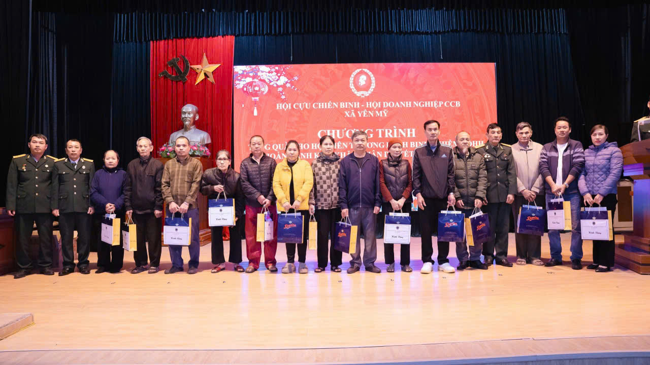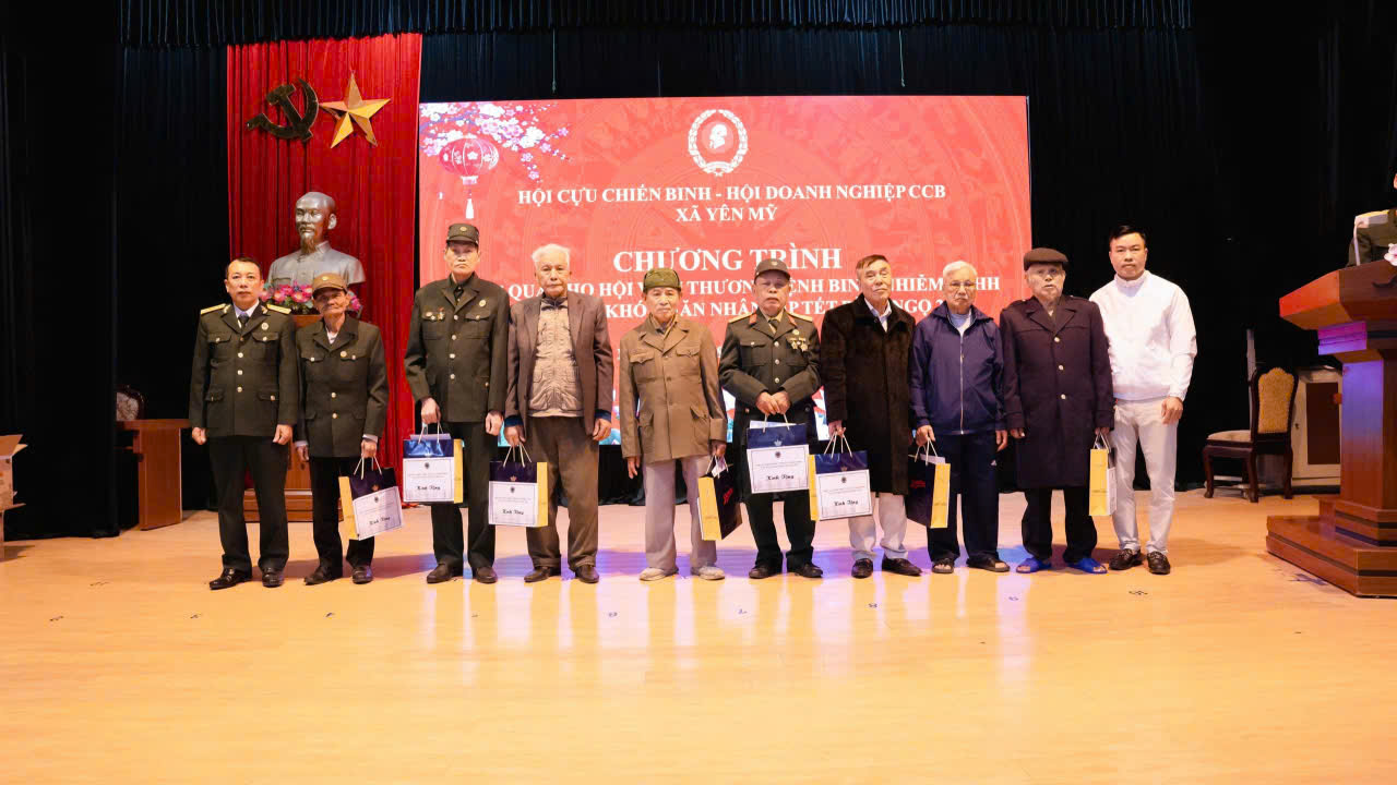 Nhân dịp Tết nguyên đán Bính Ngọ 2026, Hội CCB xã Yên Mỹ đã huy động các nguồn lực, trao tặng 125 suất quà cho hội viên là thương binh, bệnh binh nặng, nạn nhân nhiễm chất độc da cam và hội viên có hoàn cảnh khó khăn, tổng trị giá 67 triệu đồng, cụ thể: